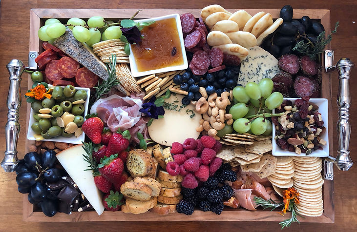 Beautiful spread featuring cured and smoked meats, fine cheeses, organic fruit and nuts, dips, spreads, crackers, and more! Priced per person.